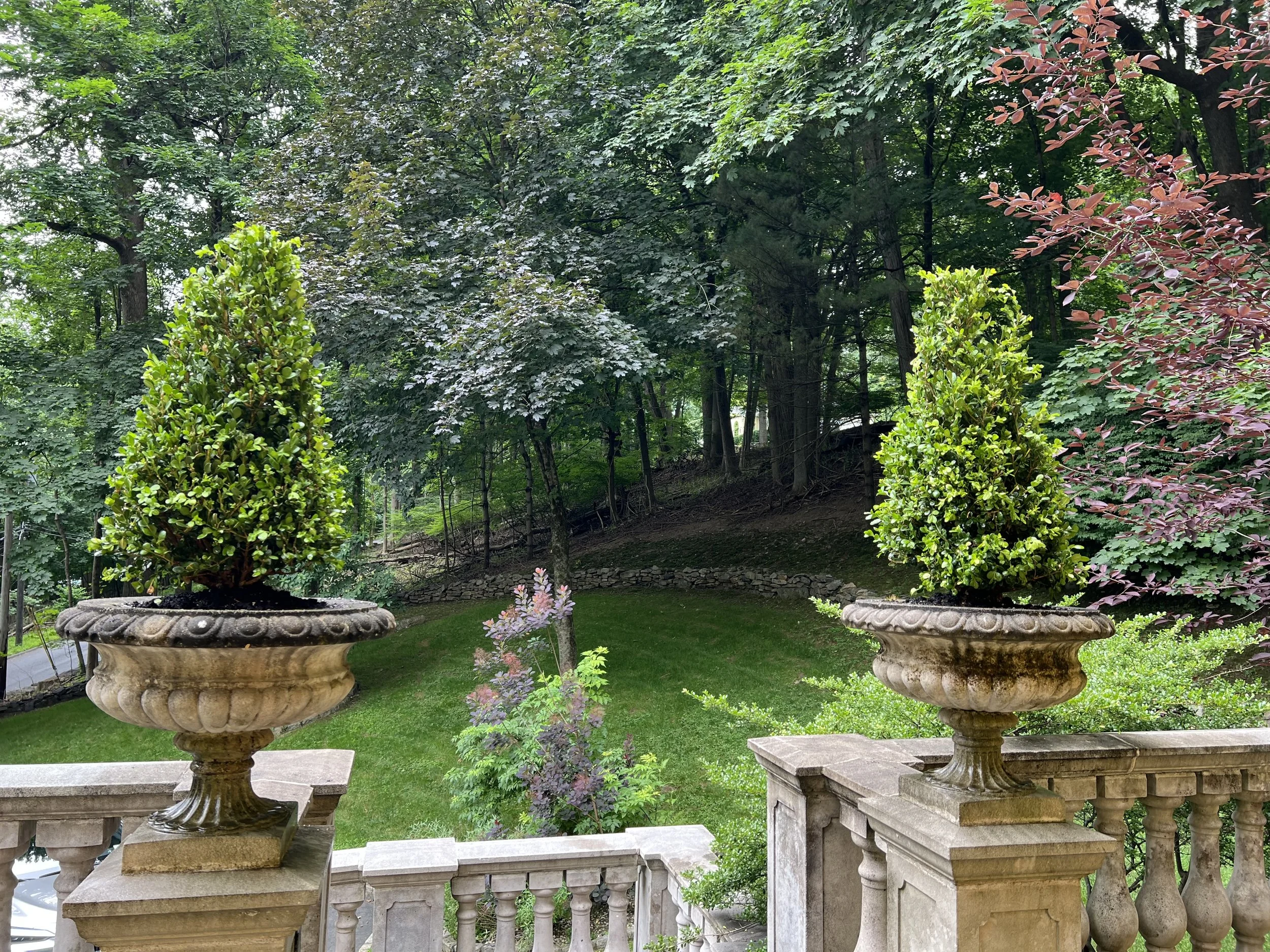 Above: A formal garden with topiary urns in Briarcliff Manor